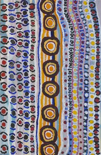 This work portrays an area of Country that can be interpreted in multiple ways. Firstly, the image may be read as an aerial representation of a particular location known to the artist- either land that they or their family travelled, from the pujiman (traditional, desert dwelling) era to now. During the pujiman period, Martu would traverse very large distances annually in small family groups, moving seasonally from water source to water source, and hunting and gathering bush tucker as they went. At this time, one’s survival depended on their intimate knowledge of the location of resources; thus physical elements of Country, such as sources of kapi (water), tali (sandhills), different varieties of warta (trees, vegetation), ngarrini (camps), and jina (tracks) are typically recorded with the use of a use of a system of iconographic forms universally shared across the desert.
