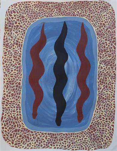 “Niminjarra is the two brothers transforming into a snake so they can go back home to Ngayartakujarra (Lake Dora). They were in training for ceremony, those two brothers, but they were kept too long and nobody was there to release them. They waited then they decided to transform into snakes to travel back to where they came from, because their mother was waiting for them. This is Jukurrpa (Dreaming story).