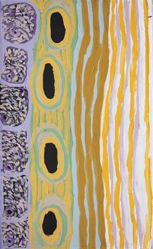 This is Lorna’s Country- her ‘ngurra’ (home Country, camp). People identify with their ngurra in terms of specific rights and responsibilities, and the possession of intimate knowledge of the physical and cultural properties of one’s Country. Painting ngurra, and in so doing sharing the Jukurrpa (Dreaming) stories and physical characteristics of that place, has today become an important means of cultural maintenance.