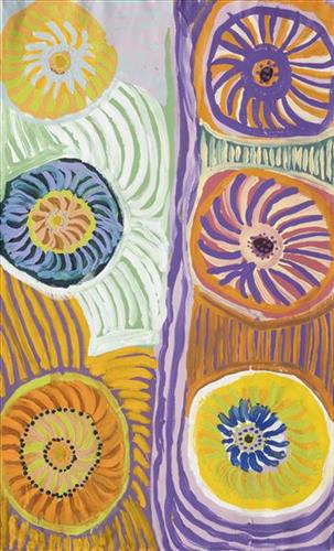 This is Lorna’s Country- her ‘ngurra’ (home Country, camp). People identify with their ngurra in terms of specific rights and responsibilities, and the possession of intimate knowledge of the physical and cultural properties of one’s Country. Painting ngurra, and in so doing sharing the Jukurrpa (Dreaming) stories and physical characteristics of that place, has today become an important means of cultural maintenance.