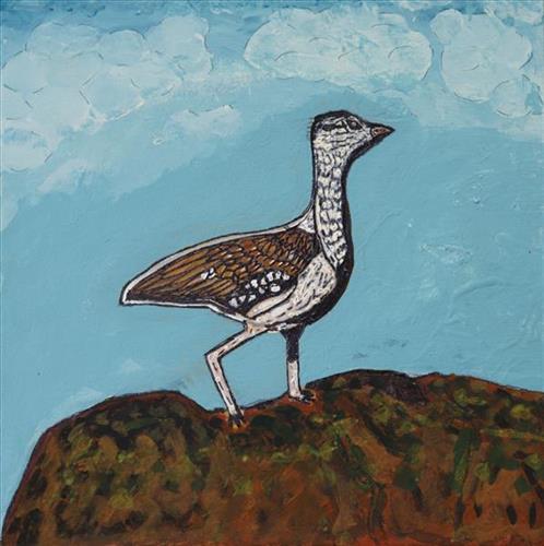 Kipara (Australian Bustard, bush turkey) are ground-dwelling, large, speckled grey-brown birds found in the plains of the Western Desert and across northern Australia. Kipara fly long distances in the search of food, and were once widespread among the plains of Australia. However, following colonisation they have become increasingly rare. Kipara often travel in groups, and walk slowly, picking at food such as jinyjiwirrily (wild gooseberry, desert raisin), and are usually found at twilight and after dark.