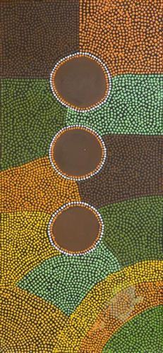 This work portrays an area of Country that can be interpreted in multiple ways. Firstly, the image may be read as an aerial representation of a particular location known to the artist- either land that they or their family travelled, from the pujiman (traditional, desert dwelling) era to now. During the pujiman period, Martu would traverse very large distances annually in small family groups, moving seasonally from water source to water source, and hunting and gathering bush tucker as they went. At this time, one’s survival depended on their intimate knowledge of the location of resources; thus physical elements of Country, such as sources of kapi (water), tali (sandhills), different varieties of warta (trees, vegetation), ngarrini (camps), and jina (tracks) are typically recorded with the use of a use of a system of iconographic forms universally shared across the desert.