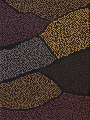 Younger Martu artists often start painting alongside their parents, grandparents, and extended family, which fosters an organic learning process. This not only involves mastering painting techniques but also understanding specific locations, family histories, traditional ways of life, bush tucker, and Jukurrpa (Dreaming). Over time, with encouragement from their peers, they develop their own distinct styles and explore unique painting techniques and subject matter. In this work the artist brings a contemporary, evolving perspective to their work.