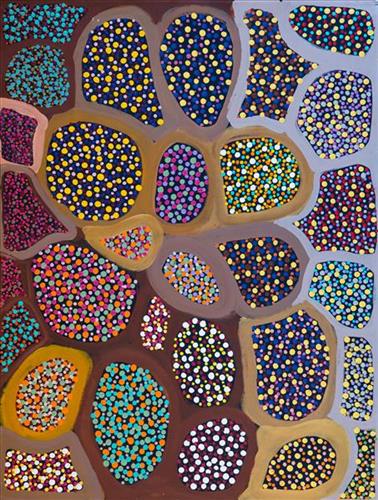 This work depicts a linyji (claypan) within the artists’ ngurra (home Country, camp), typically represented with circular forms. Claypans were visited more often during the wet seasons as they filled with water. As Kuru here describes, besides being a valuable water source, claypans were also ingeniously utilized for the removal of husks from seeds before consumption. Additionally, the clay itself was applied topically for its healing properties, aiding in the treatment of burns and soothing headaches.