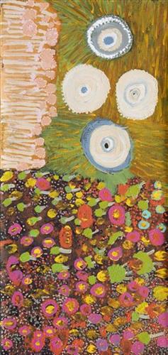 “All around is sandhills and lakes on every side. You can see the grass, but the lakes are all dry. In the middle is Puntawarri waterhole. That’s the jila (snake) place, two jila. They nyupa (spouses), they darlings, man and woman. They sleeping near to Puntawarri. It’s a hole in the ground- that jila will come out of the ground and all the dust will go everywhere. All the dust going everywhere, the dust that flies up when the jila flies up out of its hole. The jila isn’t in that place anymore. It’s gone now but that jila used to stop there.”