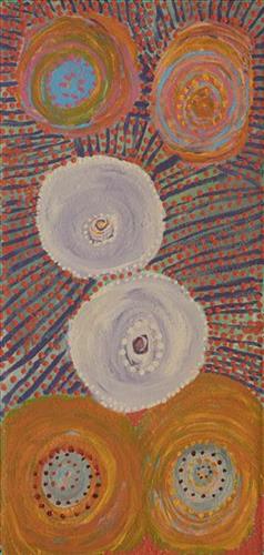 This is Dale’s Country- her ‘ngurra’ (home Country, camp). People identify with their ngurra in terms of specific rights and responsibilities, and the possession of intimate knowledge of the physical and cultural properties of one’s Country. Painting ngurra, and in so doing sharing the Jukurrpa (Dreaming) stories and physical characteristics of that place, has today become an important means of cultural maintenance. Dale’s ngurra encompasses her birthplace, Jigalong, and the Country that her family walked in the pujiman (traditional, desert-dwelling) era, including Puntawarri, Raarki (Canning Stock Route Well 27), Kularti, Kumpupirntily , Mirtikanya, (Kumpupintily, Lake Disappointment), and Mukurtu.