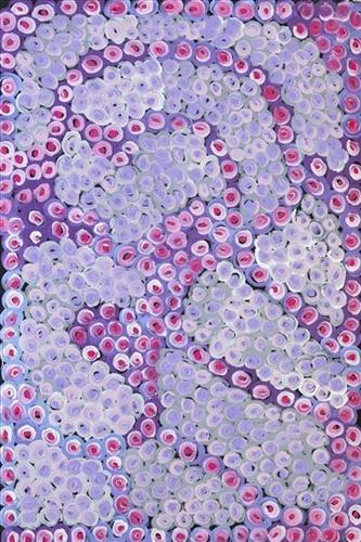 This work portrays an area of Country that can be interpreted in multiple ways. Firstly, the image may be read as an aerial representation of a particular location known to the artist- either land that they or their family travelled, from the pujiman (traditional, desert dwelling) era to now. During the pujiman period, Martu would traverse very large distances annually in small family groups, moving seasonally from water source to water source, and hunting and gathering bush tucker as they went. At this time, one’s survival depended on their intimate knowledge of the location of resources; thus physical elements of Country, such as sources of kapi (water), tali (sandhills), different varieties of warta (trees, vegetation), ngarrini (camps), and jina (tracks) are typically recorded with the use of a use of a system of iconographic forms universally shared across the desert.