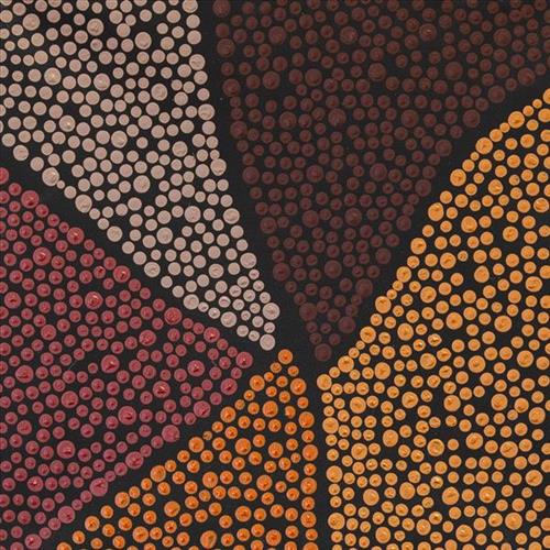 Younger Martu artists often start painting alongside their parents, grandparents, and extended family, which fosters an organic learning process. This not only involves mastering painting techniques but also understanding specific locations, family histories, traditional ways of life, bush tucker, and Jukurrpa (Dreaming). Over time, with encouragement from their peers, they develop their own distinct styles and explore unique painting techniques and subject matter. In this work the artist brings a contemporary, evolving perspective to their work.