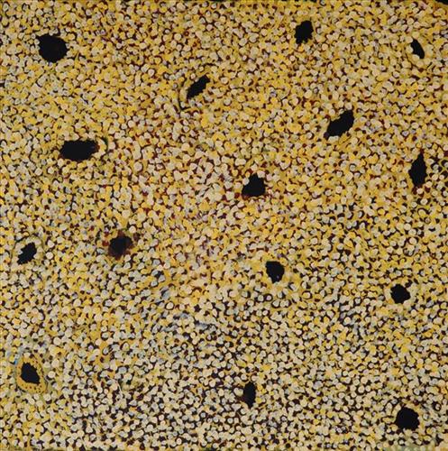 This is Mayiwalku’s Country- her ‘ngurra’ (home Country, camp). People identify with their ngurra in terms of specific rights and responsibilities, and the possession of intimate knowledge of the physical and cultural properties of one’s Country. Painting ngurra, and in so doing sharing the Jukurrpa (Dreaming) stories and physical characteristics of that place, has today become an important means of cultural maintenance.