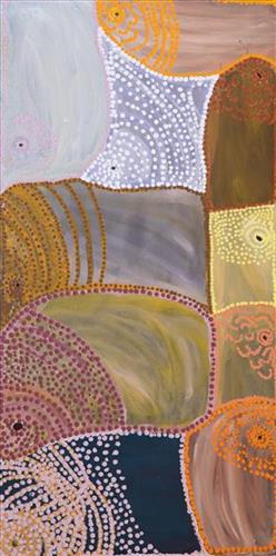 This work depicts a waterhole in the area around Moolyella, an area close to Marble Bar that was mined for tin from 1898. Industrial production ceased by 1921, and from the late 1920’s several Aboriginals families, including Lorna’s, began working the mine. Tin and other minerals were retrieved from claypans and dry river beds using a yandy (dish used for winnowing seed).
