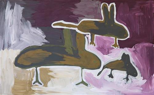 Most often explored in Doreen’s works are the motifs of her everyday modern Aboriginal community life; the animals hunted and plants gathered for bush tucker, the cars and aeroplanes used to travel to the cities and remote communities she regularly moves between, and depictions of the Country itself.