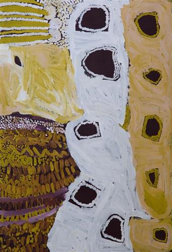 Mayiwalku lived for many years at Jigalong Mission before eventually relocating with her five children to Warralong, a community south east of Port Hedland. She continues to live in Warralong today with her daughter and equally renowned artist, Doreen Chapman. Mayiwalku was one of Martumili’s pioneering artists, and is highly regarded for her technically sophisticated works. Her paintings depict her ngurra (home Country, camp); the Country she walked as a young woman, its animals, plants, waterholes and associated Jukurrpa (Dreaming) narratives. Mayiwalku’s work has been exhibited widely across Australia and internationally, and acquired by the National Museum of Australia.