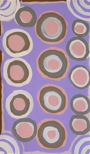 This work portrays an area of Country that can be interpreted in multiple ways. Firstly, the image may be read as an aerial representation of a particular location known to the artist- either land that they or their family travelled, from the pujiman (traditional, desert dwelling) era to now. During the pujiman period, Martu would traverse very large distances annually in small family groups, moving seasonally from water source to water source, and hunting and gathering bush tucker as they went. At this time, one’s survival depended on their intimate knowledge of the location of resources; thus physical elements of Country, such as sources of kapi (water), tali (sandhills), different varieties of warta (trees, vegetation), ngarrini (camps), and jina (tracks) are typically recorded with the use of a use of a system of iconographic forms universally shared across the desert.