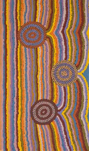Depicted in this work are tali and sources of kapi (water) within the artists’ ngurra (home Country, camp). Today Martu Country is still defined in terms of the location and type of water. Each of the hundreds of claypans, rockholes, waterholes, soaks and springs found in the Martu desert homelands is known through real life experience and the recounting of Jukurrpa (Dreaming) narratives by name, location, quality and seasonal availability. For thousands of years, Aboriginal people have typically represented water with circular forms, and tali with linear groupings in rock art, sand drawings, and now contemporary paintings.