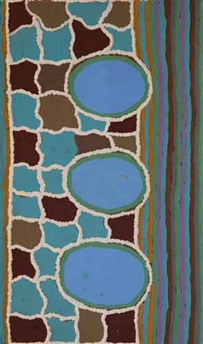 This work portrays an area of Country that can be interpreted in multiple ways. Firstly, the image may be read as an aerial representation of a particular location known to the artist- either land that they or their family travelled, from the pujiman (traditional, desert dwelling) era to now. During the pujiman period, Martu would traverse very large distances annually in small family groups, moving seasonally from water source to water source, and hunting and gathering bush tucker as they went. At this time, one’s survival depended on their intimate knowledge of the location of resources; thus physical elements of Country, such as sources of kapi (water), tali (sandhills), different varieties of warta (trees, vegetation), ngarrini (camps), and jina (tracks) are typically recorded with the use of a use of a system of iconographic forms universally shared across the desert.