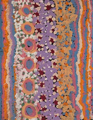 Depicted in this work are a combination of desert flowers and traditional types of mayi (plant food).