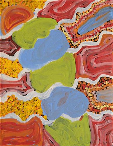 This work portrays an area of Country that can be interpreted in multiple ways. Firstly, the image may be read as an aerial representation of a particular location known to the artist- either land that they or their family travelled, from the pujiman (traditional, desert dwelling) era to now. During the pujiman period, Martu would traverse very large distances annually in small family groups, moving seasonally from water source to water source, and hunting and gathering bush tucker as they went. At this time, one’s survival depended on their intimate knowledge of the location of resources; thus physical elements of Country, such as sources of kapi (water), tali (sandhills), different varieties of warta (trees, vegetation), ngarrini (camps), and jina (tracks) are typically recorded with the use of a use of a system of iconographic forms universally shared across the desert.