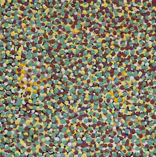 This work depicts a waterhole in the area around Moolyella, an area close to Marble Bar that was mined for tin from 1898. Industrial production ceased by 1921, and from the late 1920’s several Aboriginals families, including Lorna’s, began working the mine. Tin and other minerals were retrieved from claypans and dry river beds using a yandy (dish used for winnowing seed).