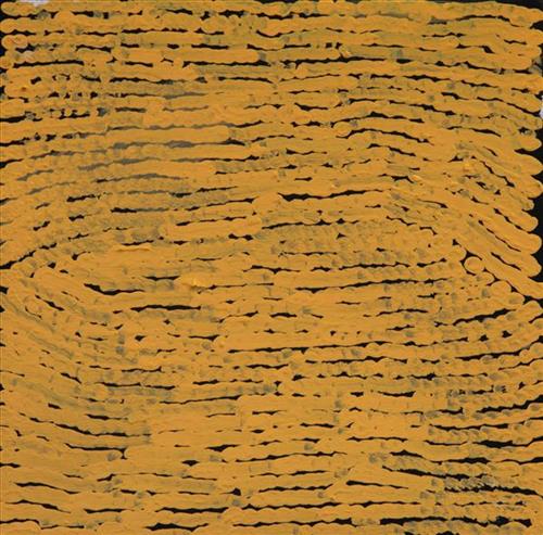 This work depicts a waterhole in the area around Moolyella, an area close to Marble Bar that was mined for tin from 1898. Industrial production ceased by 1921, and from the late 1920’s several Aboriginals families, including Lorna’s, began working the mine. Tin and other minerals were retrieved from claypans and dry river beds using a yandy (dish used for winnowing seed).