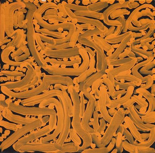 Portrayed in this work are features of Mayiwalku’s ngurra, such as the dominant permanent red tali (sandhills), warta (trees, vegetation), and the individually named water sources she and her family camped at. These include Januwa, Jilankujarra, Karlajarntu, Kartungu, Kularti, Kumpupajanu, Kunalimpi, Kunarra, Marnakarti, Pangkapirni, Wilunganinya, Wurur-wururna, Yilyara, and Yirrajarra Rock holes, waterholes, soaks and springs were all extremely important sites for Martu people during the pujiman period, and are generally depicted with circular forms.