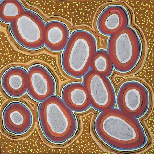This work portrays an area of Country that can be interpreted in multiple ways. Firstly, the image may be read as an aerial representation of a particular location known to the artist- either land that they or their family travelled, from the pujiman (traditional, desert dwelling) era to now. During the pujiman period, Martu would traverse very large distances annually in small family groups, moving seasonally from water source to water source, and hunting and gathering bush tucker as they went. At this time, one’s survival depended on their intimate knowledge of the location of resources; thus physical elements of Country, such as sources of kapi (water), tali (sandhills), different varieties of warta (trees, vegetation), ngarrini (camps), and jina (tracks) are typically recorded with the use of a use of a system of iconographic forms universally shared across the desert.