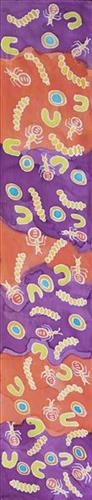 Depicted in this work are traditional types of bush tucker, their habitats, and their related hunting and gathering methods. During the pujiman (traditional, desert dwelling) period, Martu would traverse very large distances annually in small family groups, moving seasonally from water source to water source, and hunting and gathering bush tucker as they went. Whilst desert life has moved away from mobile hunter-gatherer subsistence throughout the course of the twentieth century, bush tucker continues to be a significant component of the modern Martu diet. Hunting and gathering bush tucker remains equally valuable as an important cultural practice that is passed on intergenerationally. Though hunting and gathering implements have been modernised, methods of harvesting, tracking and the use of fire burning to drive animals from their retreats are still commonly practiced today.