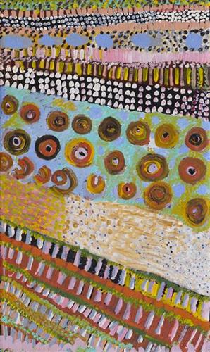 This is Dale’s Country- her ‘ngurra’ (home Country, camp). People identify with their ngurra in terms of specific rights and responsibilities, and the possession of intimate knowledge of the physical and cultural properties of one’s Country. Painting ngurra, and in so doing sharing the Jukurrpa (Dreaming) stories and physical characteristics of that place, has today become an important means of cultural maintenance. Dale’s ngurra encompasses her birthplace, Jigalong, and the Country that her family walked in the pujiman (traditional, desert-dwelling) era, including Puntawarri, Raarki (Canning Stock Route Well 27), Kularti, Kumpupirntily , Mirtikanya, (Kumpupintily, Lake Disappointment), and Mukurtu.