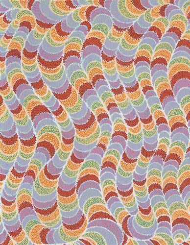 ‘’Went with Martumili. Old Jigalong. Judith’s nanna Country, where Judith nanna was born. Went from old Jigalong to Jigalong to right through Parnngurr, Camped the night and then Judith’s pop went to pick him up. His name is Mr Rowlands and I call him brother. He showing me where my nanna’s Country started from Parnngurr towards Lake Disappointment. We camped the night. Judith’s nanna was getting cheeky bossing him (Mr Rowland) around; “we not married anymore that’s why I left him.” Between Lake Disappointment and Durba Springs (Pinpi) there were these beautiful rolling sand hills, we winding through them over top, we stopped half way and I looked out to the sunset saw all the glistening spinifex. The orange from the sunset lit the sand dunes up. When I do the Tuwa paintings I think of that day.’’