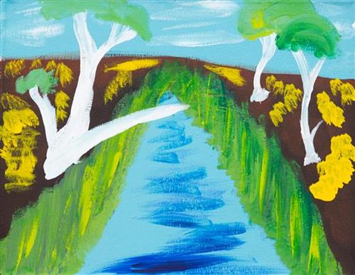 This work portrays an area known to the artist, painted here from memory. During the pujiman (traditional, desert dwelling) era one’s survival depended on their intimate knowledge of the location of resources; thus physical elements of Country, such as sources of kapi (water), tali (sandhills), and different varieties of warta (trees, vegetation) were carefully observed and remembered. Today, this relationship with Country remains equally strong, despite the movement of Martu out of the desert and into remote Aboriginal communities, towns and cities.