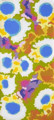Younger Martu artists often start painting alongside their parents, grandparents, and extended family, which fosters an organic learning process. This not only involves mastering painting techniques but also understanding specific locations, family histories, traditional ways of life, bush tucker, and Jukurrpa (Dreaming). Over time, with encouragement from their peers, they develop their own distinct styles and explore unique painting techniques and subject matter. In this work the artist brings a contemporary, evolving perspective to their work.