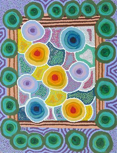 Younger Martu artists often start painting alongside their parents, grandparents, and extended family, which fosters an organic learning process. This not only involves mastering painting techniques but also understanding specific locations, family histories, traditional ways of life, bush tucker, and Jukurrpa (Dreaming). Over time, with encouragement from their peers, they develop their own distinct styles and explore unique painting techniques and subject matter. In this work the artist brings a contemporary, evolving perspective to their work.