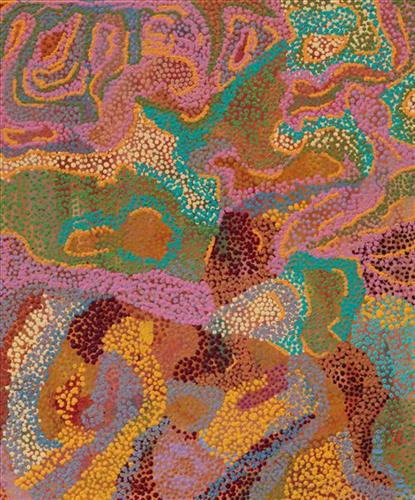 Younger Martu artists often start painting alongside their parents, grandparents, and extended family, which fosters an organic learning process. This not only involves mastering painting techniques but also understanding specific locations, family histories, traditional ways of life, bush tucker, and Jukurrpa (Dreaming). Over time, with encouragement from their peers, they develop their own distinct styles and explore unique painting techniques and subject matter. In this work the artist brings a contemporary, evolving perspective to their work.