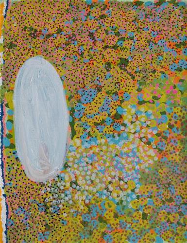 Yimiri comprises two freshwater soaks situated in the middle of a salt lake in the Percival Lakes area, within Western Australia’s Great Sandy Desert. Around these soaks the Country is dominated by permanent tuwa (sand hills). When visiting this site to drink water, the bulrushes surrounding the soaks are pushed back to access the kapi (water).