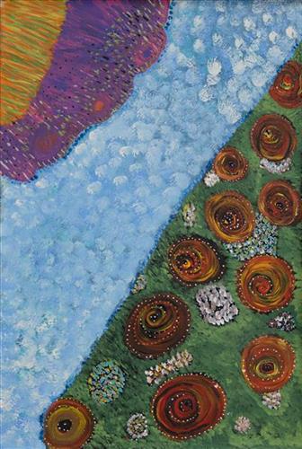 “All around is sandhills and lakes on every side. You can see the grass, but the lakes are all dry. In the middle is Puntawarri waterhole. That’s the jila (snake) place, two jila. They nyupa (spouses), they darlings, man and woman. They sleeping near to Puntawarri. It’s a hole in the ground- that jila will come out of the ground and all the dust will go everywhere. All the dust going everywhere, the dust that flies up when the jila flies up out of its hole. The jila isn’t in that place anymore. It’s gone now but that jila used to stop there.”