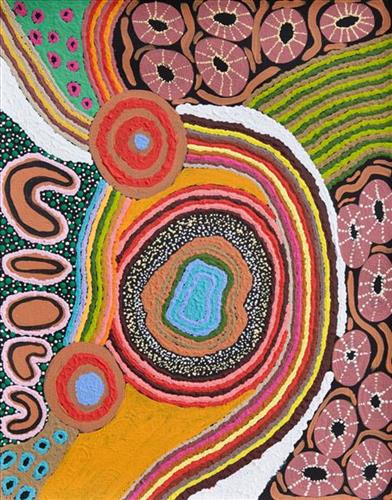 In this work Marlene depicts a claypan located in Mungili, the small outstation community situated just off the Eagle Highway in Western Australia. Mungili lies approximately 430 kilometres northeast of Wiluna and 250 kilometres north of Warburton. Marlene grew up in Mungili, and as such it forms a significant part of her ‘ngurra’ (home Country, camp). Typically Marlene depicts this site with a central large circular form that represents the main claypan, surrounded by smaller circular forms symbolising satellite water bodies.