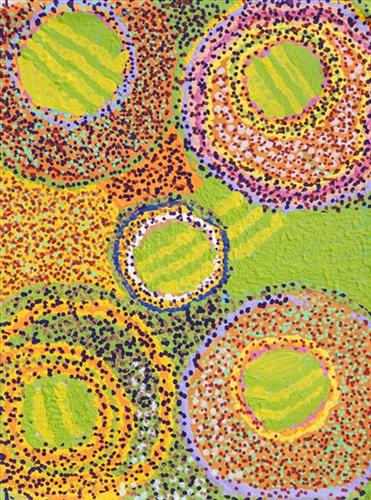 Yimiri comprises two freshwater soaks situated in the middle of a salt lake in the Percival Lakes area, within Western Australia’s Great Sandy Desert. Around these soaks the Country is dominated by permanent tuwa (sand hills). When visiting this site to drink water, the bulrushes surrounding the soaks are pushed back to access the kapi (water).