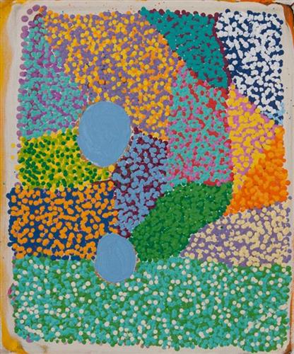 Younger Martu artists often start painting alongside their parents, grandparents, and extended family, which fosters an organic learning process. This not only involves mastering painting techniques but also understanding specific locations, family histories, traditional ways of life, bush tucker, and Jukurrpa (Dreaming). Over time, with encouragement from their peers, they develop their own distinct styles and explore unique painting techniques and subject matter. In this work the artist brings a contemporary, evolving perspective to their work.