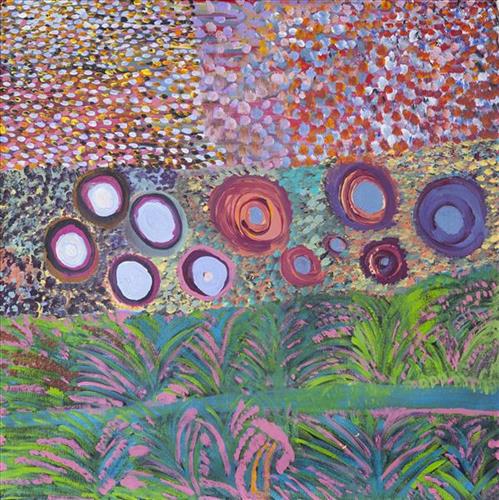 This is Dale’s Country- her ‘ngurra’ (home Country, camp). People identify with their ngurra in terms of specific rights and responsibilities, and the possession of intimate knowledge of the physical and cultural properties of one’s Country. Painting ngurra, and in so doing sharing the Jukurrpa (Dreaming) stories and physical characteristics of that place, has today become an important means of cultural maintenance. Dale’s ngurra encompasses her birthplace, Jigalong, and the Country that her family walked in the pujiman (traditional, desert-dwelling) era, including Puntawarri, Raarki (Canning Stock Route Well 27), Kularti, Kumpupirntily , Mirtikanya, (Kumpupintily, Lake Disappointment), and Mukurtu.