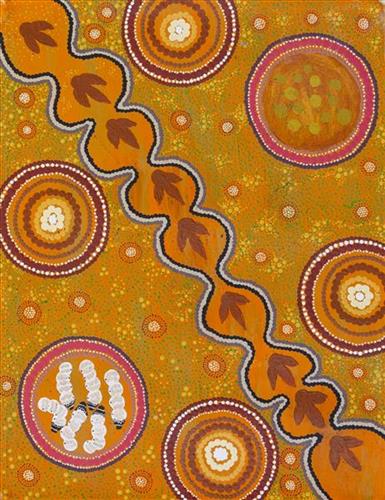 Depicted in this work are traditional types of bush tucker, their habitats, and their related hunting and gathering methods. During the pujiman (traditional, desert dwelling) period, Martu would traverse very large distances annually in small family groups, moving seasonally from water source to water source, and hunting and gathering bush tucker as they went. Whilst desert life has moved away from mobile hunter-gatherer subsistence throughout the course of the twentieth century, bush tucker continues to be a significant component of the modern Martu diet. Hunting and gathering bush tucker remains equally valuable as an important cultural practice that is passed on intergenerationally. Though hunting and gathering implements have been modernised, methods of harvesting, tracking and the use of fire burning to drive animals from their retreats are still commonly practiced today.