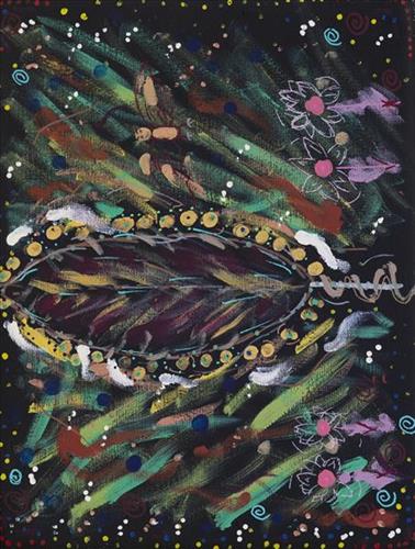 Younger Martu artists often start painting alongside their parents, grandparents, and extended family, which fosters an organic learning process. This not only involves mastering painting techniques but also understanding specific locations, family histories, traditional ways of life, bush tucker, and Jukurrpa (Dreaming). Over time, with encouragement from their peers, they develop their own distinct styles and explore unique painting techniques and subject matter. In this work the artist brings a contemporary, evolving perspective to their work.