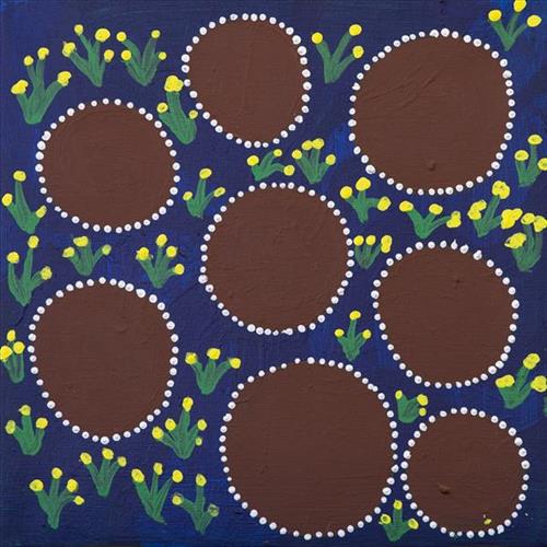This work portrays an area of Country that can be interpreted in multiple ways. Firstly, the image may be read as an aerial representation of a particular location known to the artist- either land that they or their family travelled, from the pujiman (traditional, desert dwelling) era to now. During the pujiman period, Martu would traverse very large distances annually in small family groups, moving seasonally from water source to water source, and hunting and gathering bush tucker as they went. At this time, one’s survival depended on their intimate knowledge of the location of resources; thus physical elements of Country, such as sources of kapi (water), tali (sandhills), different varieties of warta (trees, vegetation), ngarrini (camps), and jina (tracks) are typically recorded with the use of a use of a system of iconographic forms universally shared across the desert.