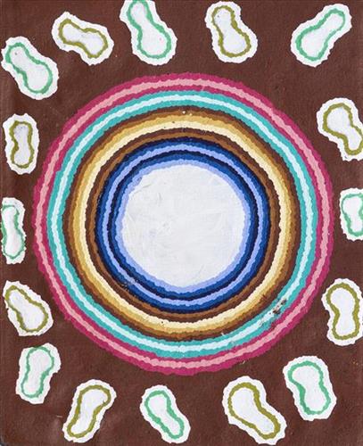 Younger Martu artists often start painting alongside their parents, grandparents, and extended family, which fosters an organic learning process. This not only involves mastering painting techniques but also understanding specific locations, family histories, traditional ways of life, bush tucker, and Jukurrpa (Dreaming). Over time, with encouragement from their peers, they develop their own distinct styles and explore unique painting techniques and subject matter. In this work the artist brings a contemporary, evolving perspective to their work.