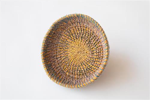 Weaving is a skill that has been practiced by Martu for thousands of years in the making of utilitarian and ceremonial items, such as yakapiri (bark sandals) and manguri (head pads for balancing carved carrying dishes). However, coiled basket weaving as an artform is a relatively newly adopted practice for the Martu, a skill passed on from Central Desert artists in the 1990’s. Leading Martu fibre arts practitioner Nola Taylor says that basket weaving was so popular amongst Martu women that it “spread across the desert like a waru (fire)”.