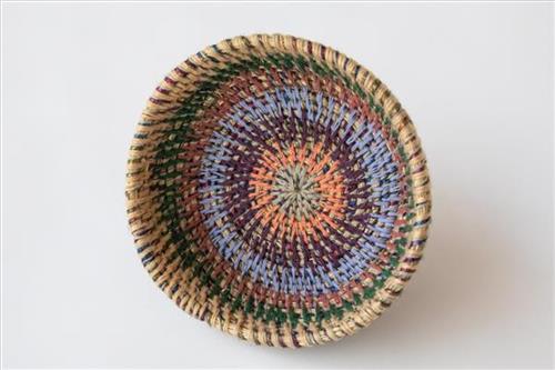Each basket is built up through wrapping fine bundles of grass in brightly coloured wool and then stitching each round on to the previous one. The baskets are primarily made from puntayarra and minarri (Amphipogon Caricinus) grass, usually collected incidentally during trips to visit family, attend ceremonies, maintain Country, and hunt and gather bush tucker. Martu artists have developed a distinctive style of basketry and individual artists continue to develop new designs and incorporate novel materials, including steel, wire and wood, into their work.