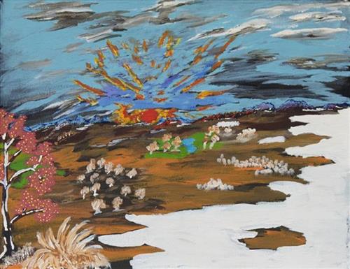 Also visible may be traces of life cycles based around kalyu (rain, water) and waru (fire). A thousands of year old practice, fire burning continues to be carried out as both an aid for hunting and a means of land management today. As the Martu travelled and hunted they would burn tracts of land, ensuring plant and animal biodiversity and reducing the risk of unmanageable, spontaneous bush fires. The patchwork nature of regrowth is visible in many landscape works, with each of the five distinctive phases of fire burning visually described with respect to the cycle of burning and regrowth.