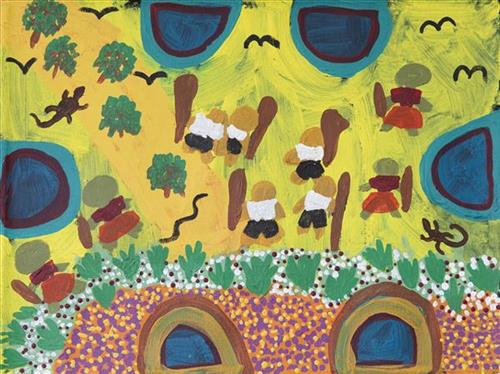 Younger Martu artists often start painting alongside their parents, grandparents, and extended family, which fosters an organic learning process. This not only involves mastering painting techniques but also understanding specific locations, family histories, traditional ways of life, bush tucker, and Jukurrpa (Dreaming). Over time, with encouragement from their peers, they develop their own distinct styles and explore unique painting techniques and subject matter. In this work the artist brings a contemporary, evolving perspective to their work.