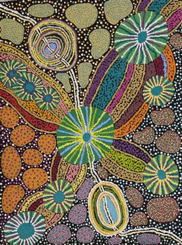 In this work Marlene depicts a waterhole and rock hole located in Mungili, the small outstation community located just off the Eagle Highway in Western Australia, approximately 430 kilometres northeast of Wiluna and 250 kilometres north of Warburton. Marlene grew up in Mungili, and as such it forms a significant part of her ‘ngurra’ (home Country, camp). Typically Marlene depicts this site with a central large circular form that represents the main waterhole, surrounded by smaller circular forms representing satellite water bodies.