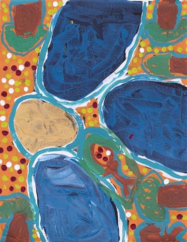 Younger Martu artists often start painting alongside their parents, grandparents, and extended family, which fosters an organic learning process. This not only involves mastering painting techniques but also understanding specific locations, family histories, traditional ways of life, bush tucker, and Jukurrpa (Dreaming). Over time, with encouragement from their peers, they develop their own distinct styles and explore unique painting techniques and subject matter. In this work the artist brings a contemporary, evolving perspective to their work.