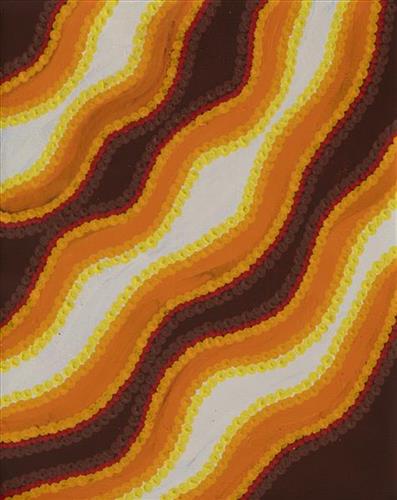 Younger Martu artists often start painting alongside their parents, grandparents, and extended family, which fosters an organic learning process. This not only involves mastering painting techniques but also understanding specific locations, family histories, traditional ways of life, bush tucker, and Jukurrpa (Dreaming). Over time, with encouragement from their peers, they develop their own distinct styles and explore unique painting techniques and subject matter. In this work the artist brings a contemporary, evolving perspective to their work.