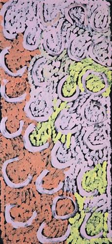 This is Mayiwalku’s Country- her ‘ngurra’ (home Country, camp). People identify with their ngurra in terms of specific rights and responsibilities, and the possession of intimate knowledge of the physical and cultural properties of one’s Country. Painting ngurra, and in so doing sharing the Jukurrpa (Dreaming) stories and physical characteristics of that place, has today become an important means of cultural maintenance.